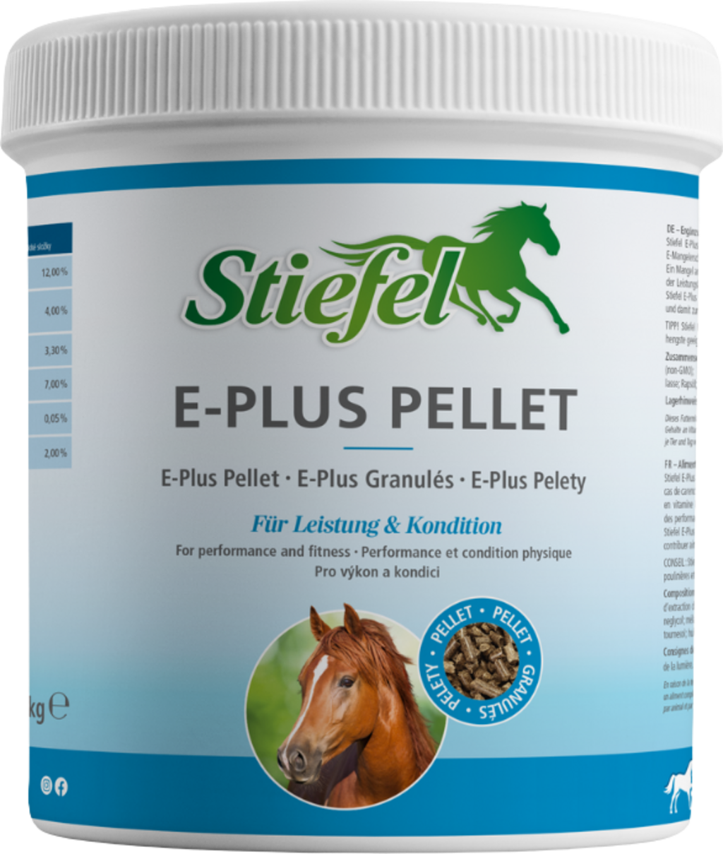 Stiefel E-Plus на пелети може да се използва, ако има недостиг на витамин Е и селен поради хранене, което може да доведе до нарушаване на производителността, кондицията и устойчивостта. Витамин Е, наричан още токоферол, е мастноразтворим витамин, който действа предимно като антиоксидант. Така витамин Е предпазва клетките от агресивни вещества и предотвратява тяхното унищожаване. В допълнение, витамин Е подобрява снабдяването с кислород на мускулите и по този начин може да повиши производителността. Ето защо витамин Е трябва винаги да се осигурява в достатъчни количества по време на спорт и по време на интензивни тренировки. Липсата на витамин Е може да доведе до спад в производителността, мускулни проблеми и напрежение. Селенът е основен микроелемент и е необходим само в малки количества за важни метаболитни процеси. Освен това селенът е компонент на различни ензими и играе важна роля в защитата на клетъчните мембрани от окислително разрушаване и в клетъчния метаболизъм.