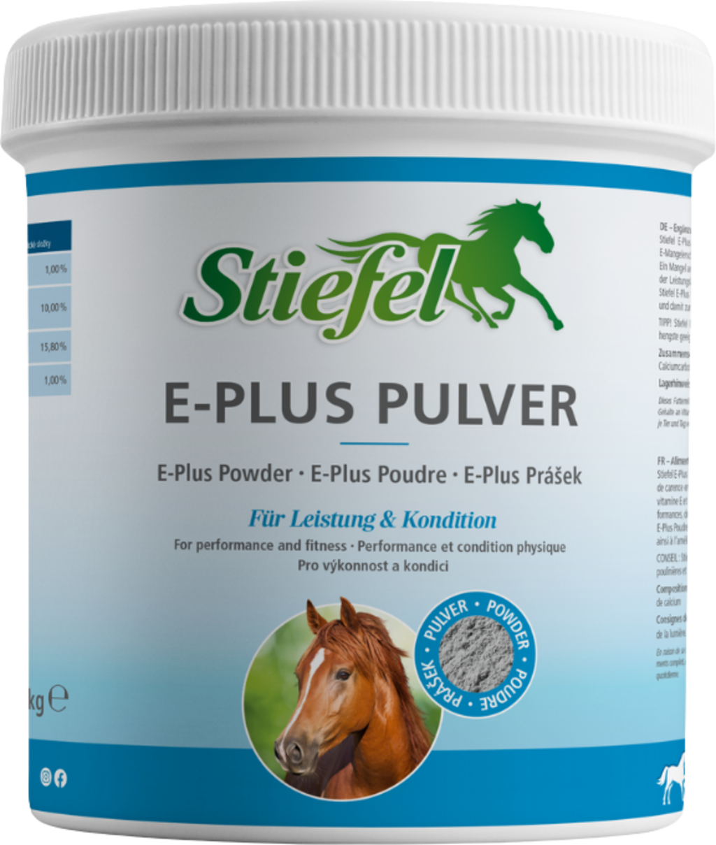 Stiefel E-Plus на прах може да се използва, ако има недостиг на витамин Е и селен поради хранене, което може да доведе до нарушаване на производителността, кондицията и устойчивостта. Витамин Е, наричан още токоферол, е мастноразтворим витамин, който действа предимно като антиоксидант. Така витамин Е предпазва клетките от агресивни вещества и предотвратява тяхното унищожаване. В допълнение, витамин Е подобрява снабдяването с кислород на мускулите и по този начин може да повиши производителността. Ето защо витамин Е трябва винаги да се осигурява в достатъчни количества по време на спорт и по време на интензивни тренировки. Липсата на витамин Е може да доведе до спад в производителността, мускулни проблеми и напрежение. Селенът е основен микроелемент и е необходим само в малки количества за важни метаболитни процеси. Освен това селенът е компонент на различни ензими и играе важна роля в защитата на клетъчните мембрани от окислително разрушаване и в клетъчния метаболизъм.