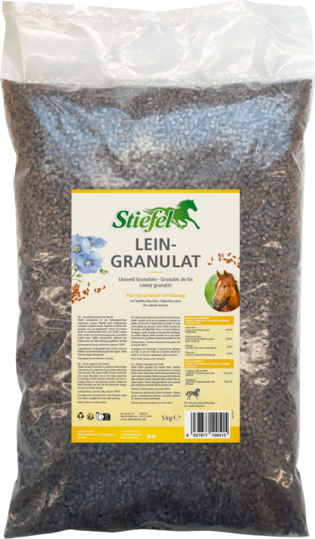 Stiefel ленени гранули е закуска на основата на ленено семе, готова за консумация! Съдържанието на масло се намалява нежно чрез студено пресоване, което го прави още по-лесно за смилане и понасяне. Благодарение на голямото количество слуз, ленът на гранули може да има положителен ефект върху храносмилателната система. Освен това е положителна подкрепа при смяната на козината.