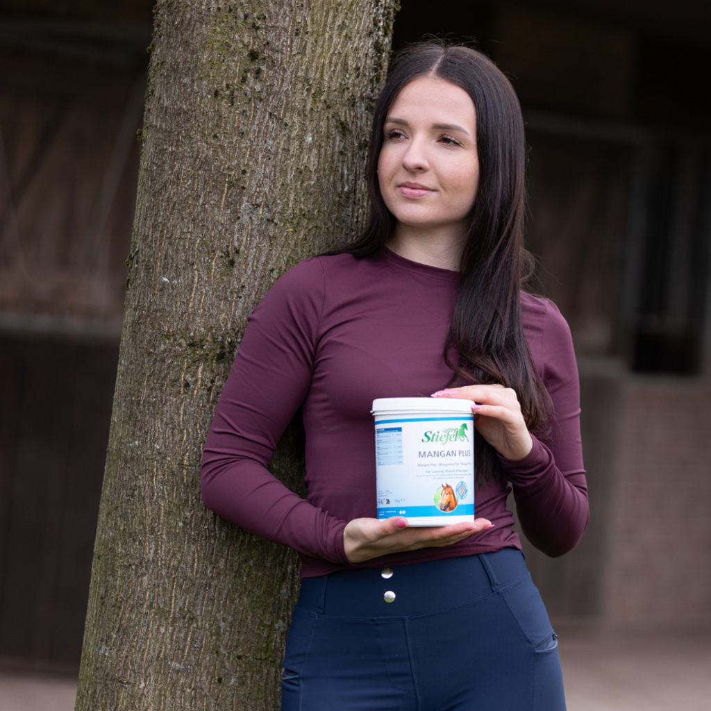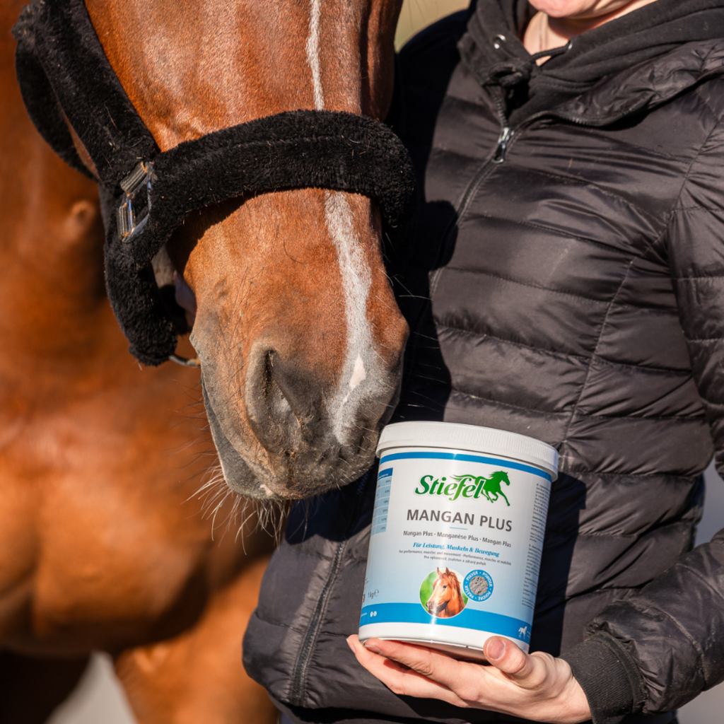 Този продукт от Stiefel съдържа основни микроелементи, които могат да компенсират всички хранителни дефицити и да помогнат за поддържане на опорно-двигателния апарат. Манганът участва в много мускулни и ставни процеси в тялото и също така е отговорен за образуването на хондроитин сулфат. Органично свързаните съставки могат да се използват най-добре от тялото и да имат положителен ефект върху сухожилията, костите и ставите на коня. Наистина, този продукт може да поддържа здрава мускулно-скелетната система и да подобри движението. В допълнение, Манган Плюс може да допринесе и за по-бърза регенерация на стресирани мускули, сухожилия и връзки.