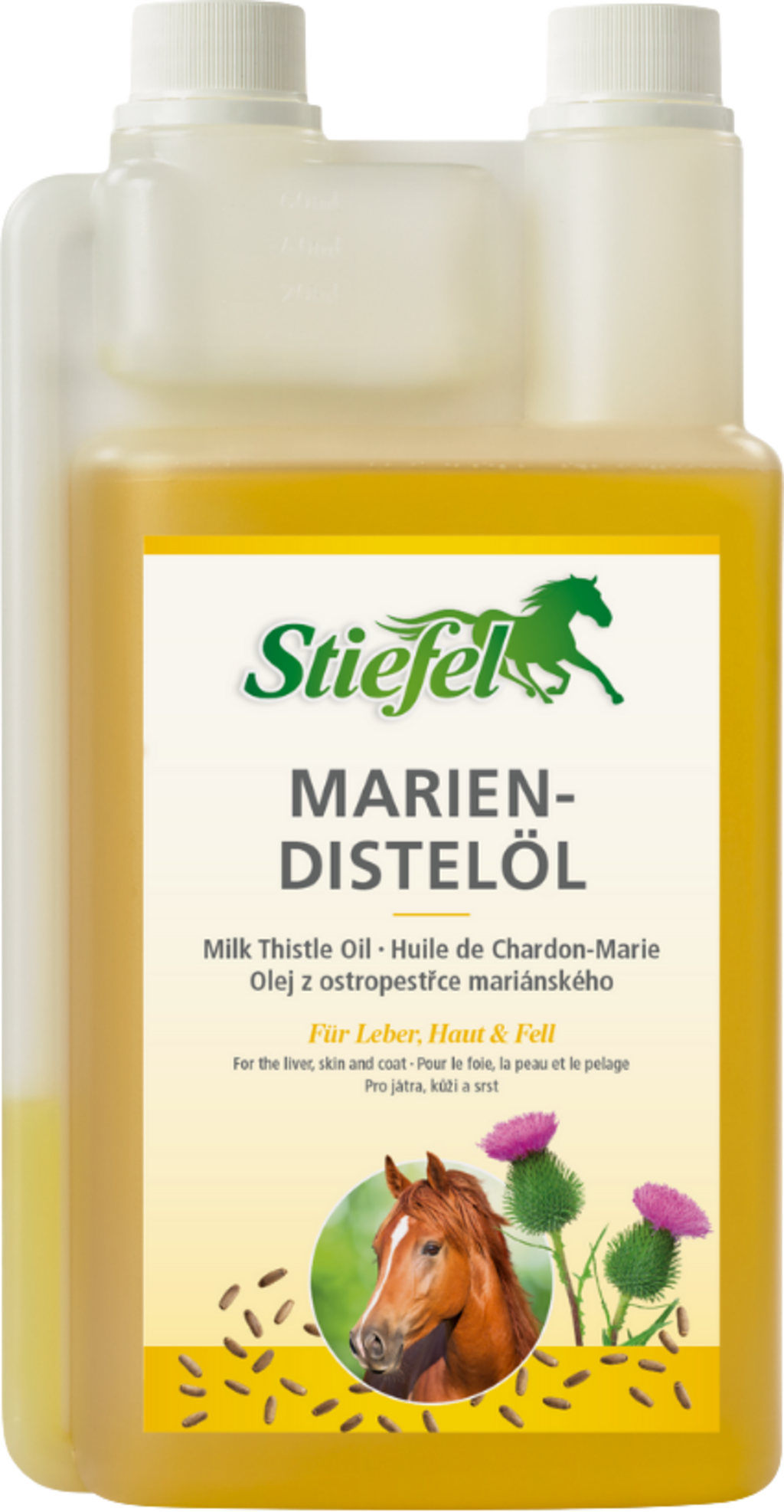 Маслото от бял трън Stiefel е 100% натурално масло, което съдържа активната съставка силимарин. Силимаринът може да стимулира регенерацията на чернодробните клетки и по този начин да насърчи промиването на метаболитните отпадни продукти. По този начин функцията на черния дроб може да бъде подкрепена. Маслото от бял трън Stiefel също е богато на есенциални омега-6 мастни киселини и може да има положителен ефект върху кожата и козината на коня.