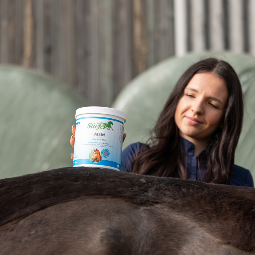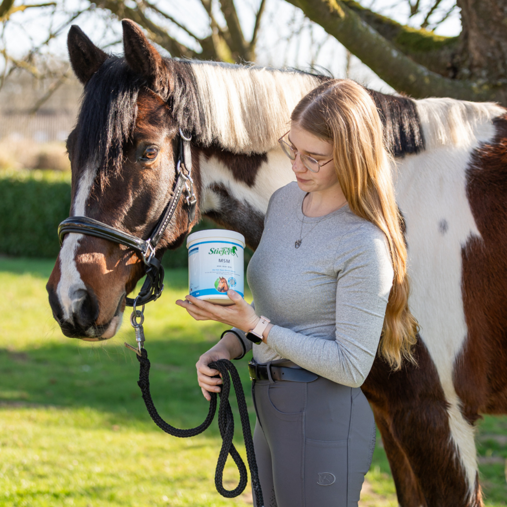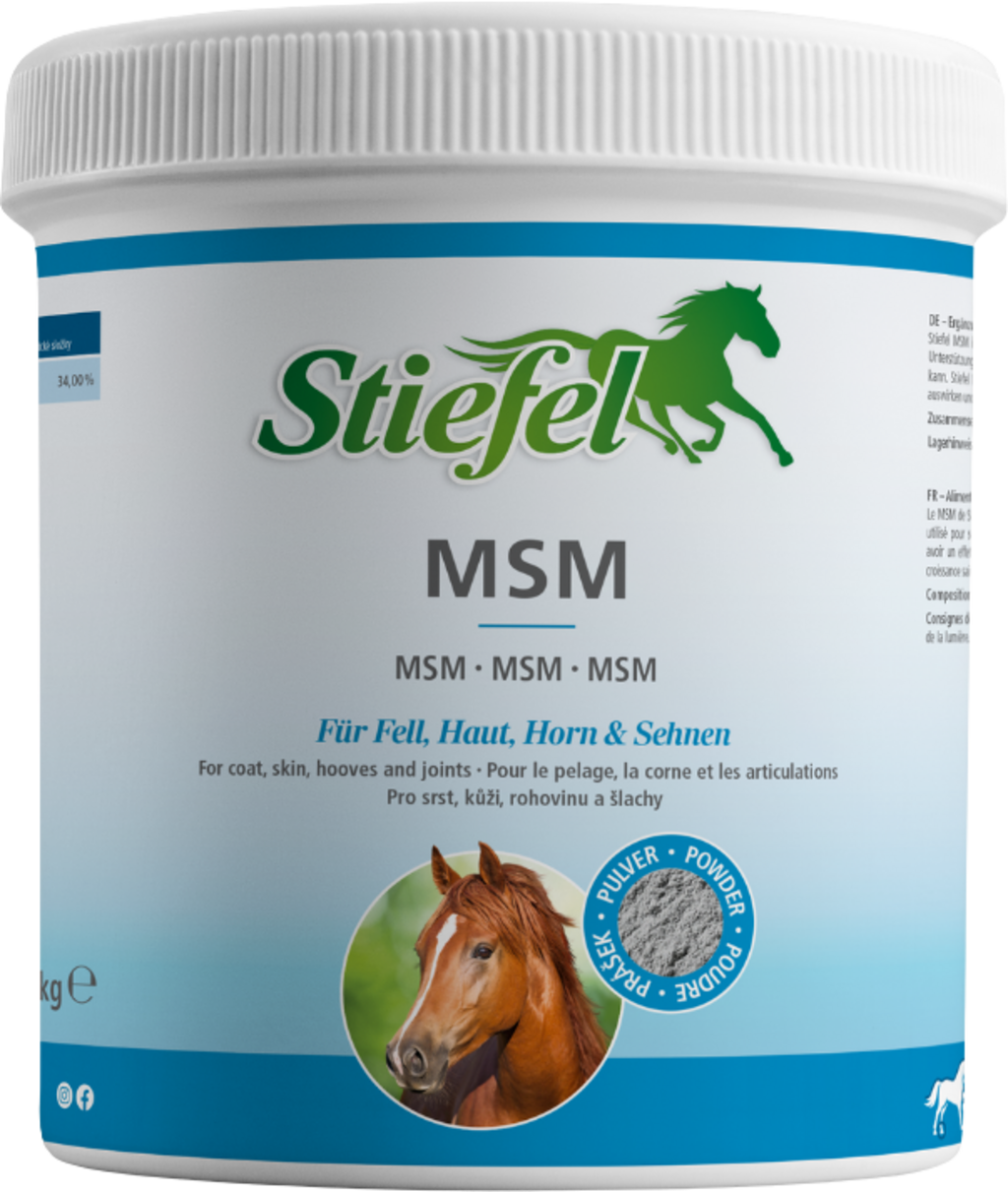 Stiefel MSM се състои от активно, органично сярно съединение (метилсулфонилметан). Твърди се, че МСМ или съдържащите сяра аминокиселини са важни свойства, особено в случай на проблеми със ставите и проблеми с козината, растежа на копита, ламинит (протеин) и ставите. Stiefel MSM може да поддържа ставите в тяхната функция и да имат положителен ефект при проблеми с кожата, козината и роговия слой. МСМ има положителни свойства за облекчаване на болката, остеоартрит и подуване във връзка с глюкозамин, хондроитин и дяволски нокът.