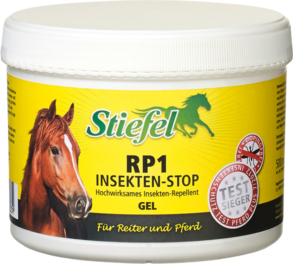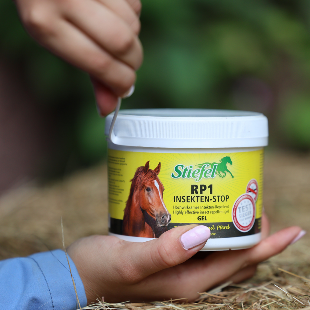 Stiefel RP1 Гел против насекоми е високоефективен репелент срещу насекоми с активна защита срещу кърлежи и насекоми под формата на гел в съответствие с наредбата за биоцидите. Stiefel RP1 Гел против насекоми е особено подходящ за чувствителни зони и коне, които са чувствителни към пръскане, тъй като гелът се нанася върху коня с предоставената гъба. В допълнение, Stiefel RP1 Гел против насекоми е без алкохол и следователно може да се използва и при коне с екзема.