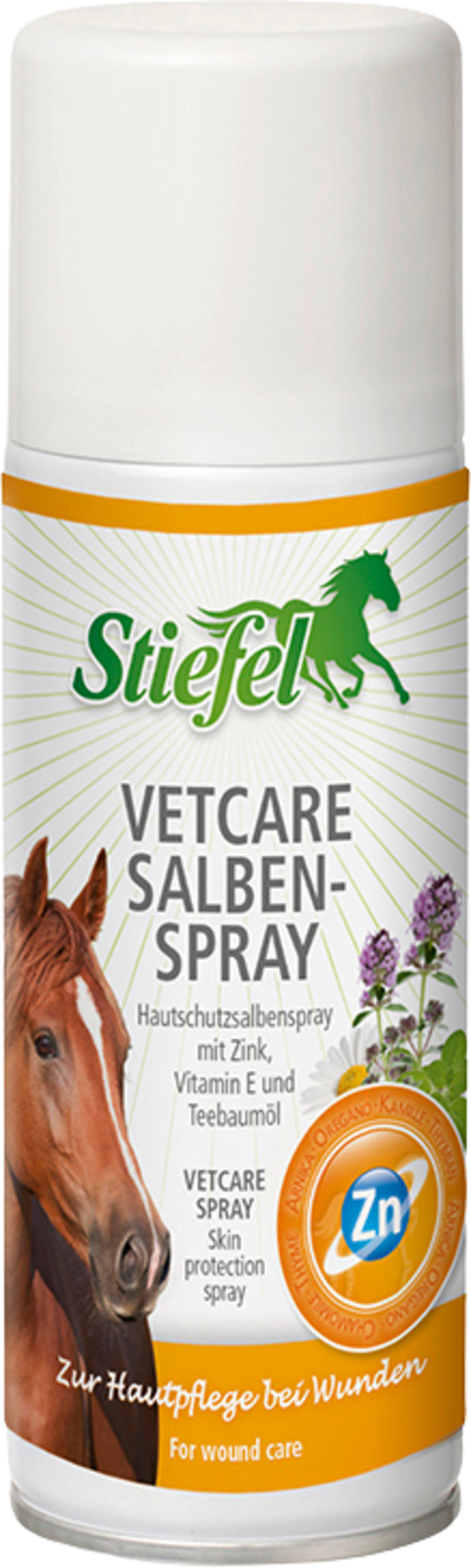 Stiefel Vetcare Спрей мехлем е спрей за грижа за кожата за първоначална грижа за рани. Подбраните билкови съставки (арника, риган, мащерка, лайка и масло от чаено дърво) в комбинация с цинк и витамин Е могат да допринесат за подобряване на заздравяването на рани. Stiefel Спрей мехлем може да успокои и да се грижи за наранена кожа. Мехлемът за защита на кожата може също да има противовъзпалителен ефект и да подпомогне лечението на кална фетлок екзема и рано от триене. Чувството на напрежение, сърбеж и склонността към раздразнение могат да бъдат облекчени.
