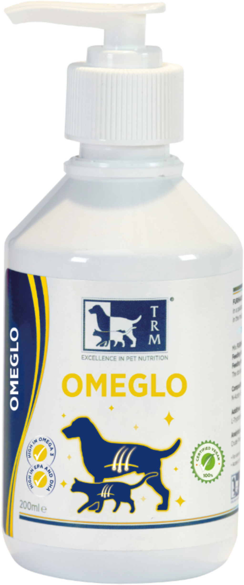 Omeglo от TRM е хранителна добавка за кучета и котки, която оптимално поддържа кожата и ставите на вашия домашен любимец. Обогатена с масло от морски водорасли, тази добавка може лесно да се добави към храната на вашия домашен любимец. Едно впръскване доставя 2 мл Omeglo.