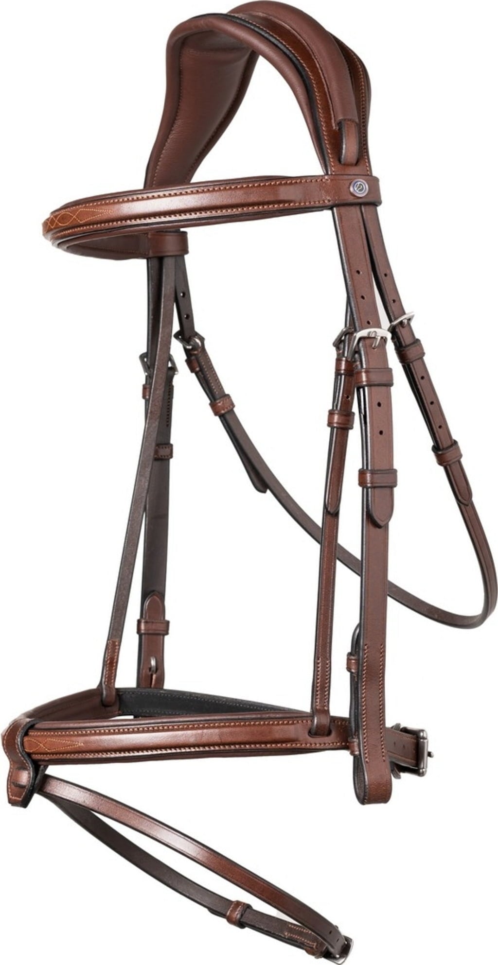 Английската комбинирана юзда Geneva се отличава с иновативен накрайник с семпли детайли. Носът преминава спретнато през вграден отвор над двойния анатомичен накрайник. Щедрата подплата с дебелина 10 см с централен изрез е особено полезна за чувствителни коне. Това оптимизира разпределението на натиска и се адаптира към анатомията на коня.