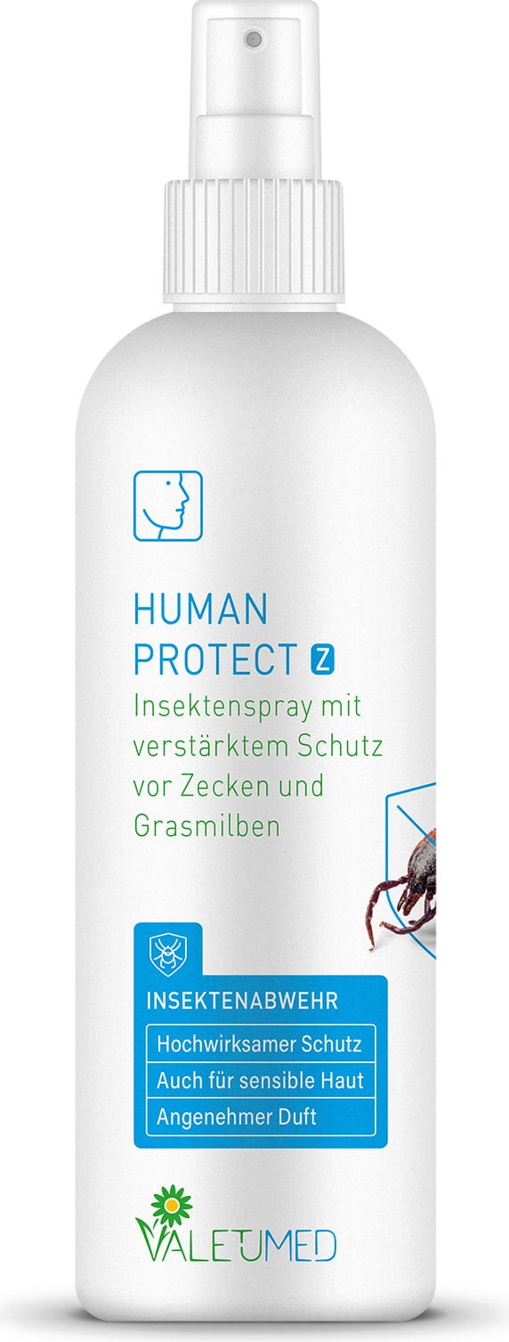 Human Protect Z от Valetumed ви осигурява надеждна защита от насекоми. Всяко лято се появяват множество насекоми и кръвосмучещи паразити. За да избегнете ухапвания, този спрей използва доказаната активна съставка икаридин, която временно маскира човешкия мирис и държи насекомите на разстояние.