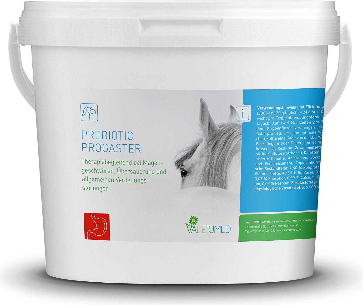 Допълващата храна Prebiotic Progaster от Valetumed е специално разработена за хранително-физиологична подкрепа на чувствителния стомах на коня.