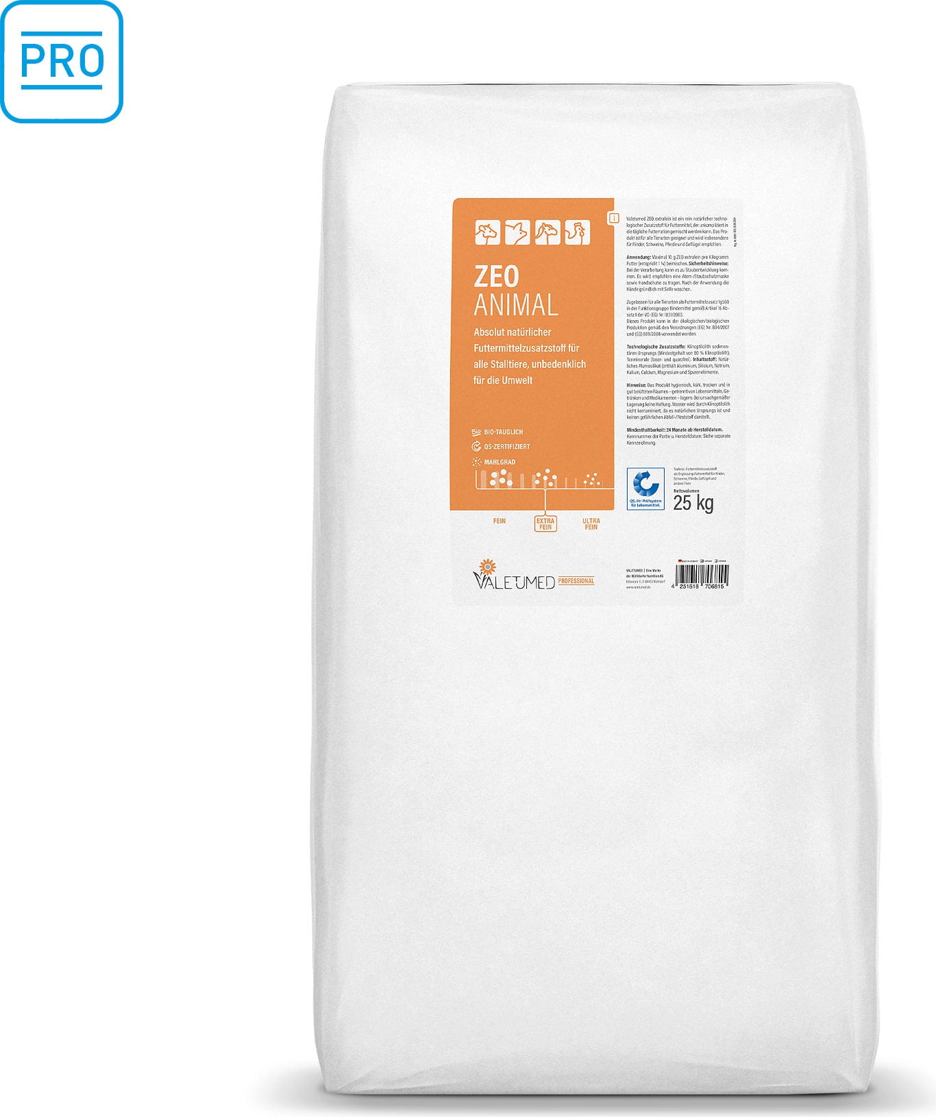 Valetumed Professional ZEO ANIMAL extrafein е изцяло натурална технологична добавка за фуражи. Ултрафино смленият прах се смесва лесно с ежедневната дажба и се препоръчва за приложение при говеда, свине, коне и птици.
