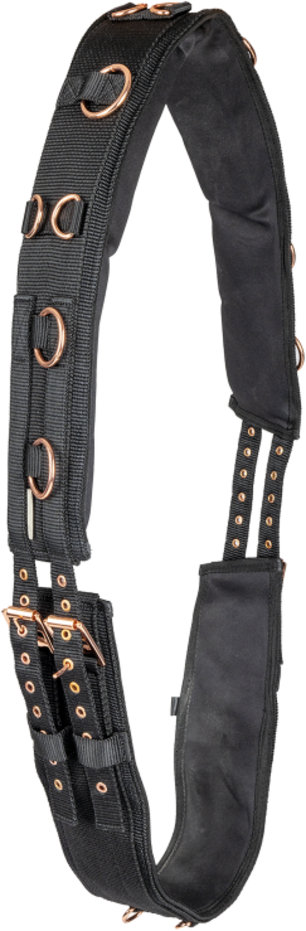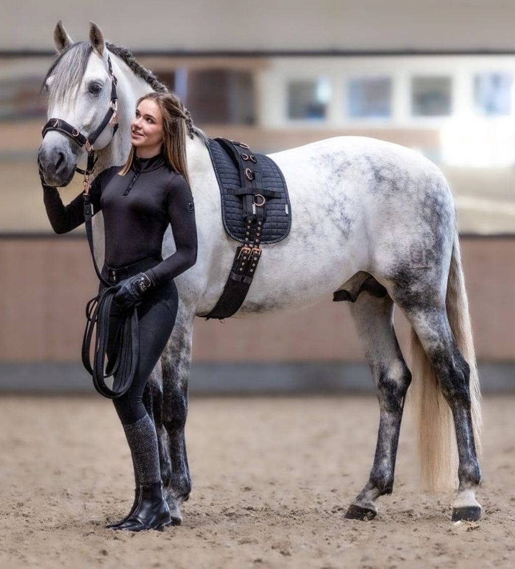 Специален акцент за тези, които ценят стила: Фитингите са завършени в елегантно розово злато, което придава на корчура луксозен вид. Функционално, корпусът впечатлява с 12 стратегически разположени халки, позволяващи гъвкаво и индивидуално персонализиране на линията на лонжиране и помощните средства за тренировка.