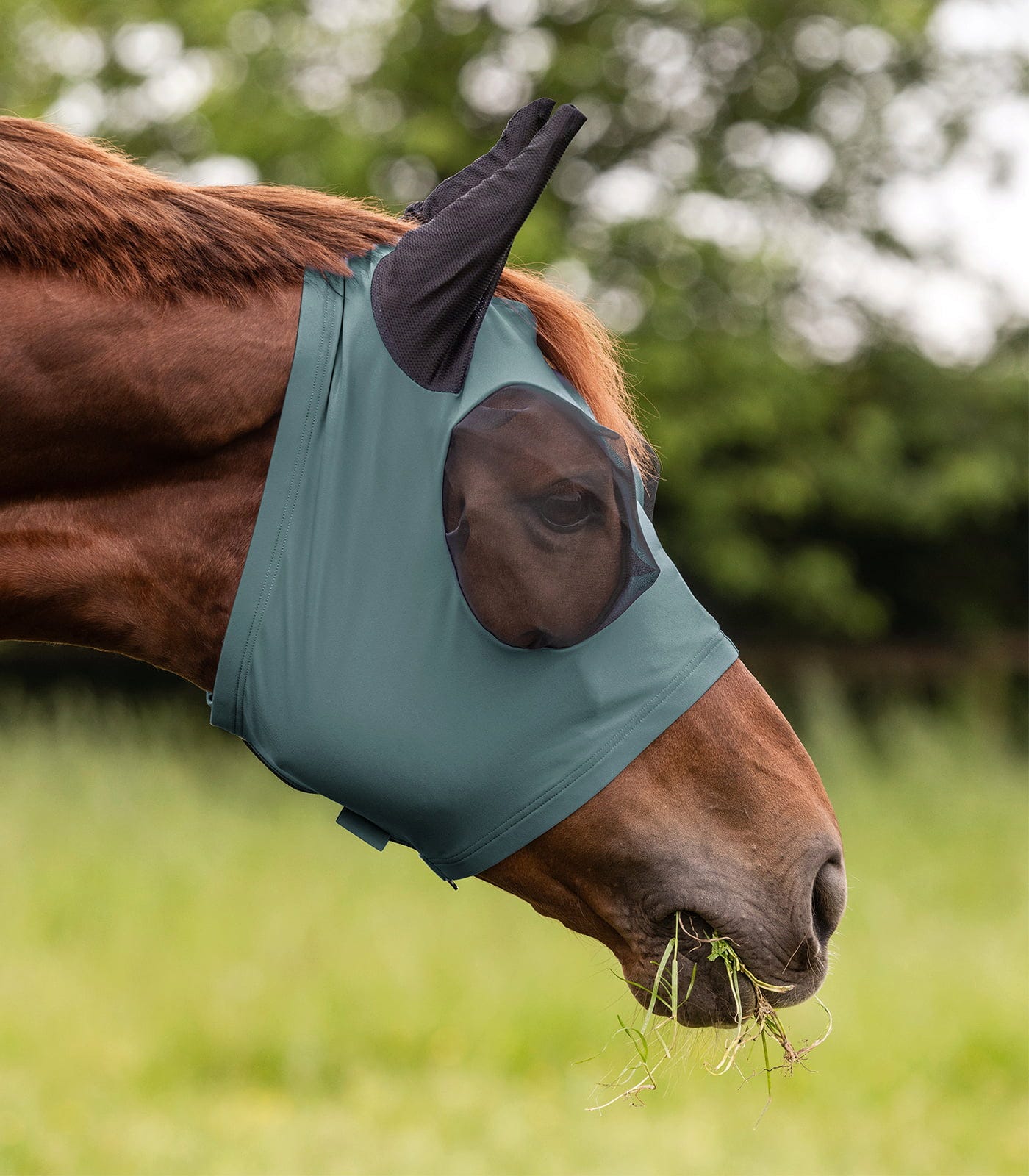 За да се предотвратят точки на натиск, всички краища на маската са завършени с мека поларена тапицерия, която нежно се приспособява към контурите на главата на коня. Интегрираните наушници, изработени от дишаща мрежа, предлагат допълнителна сигурност, без да причиняват натрупване на топлина под маската. Благодарение на широкото закопчаване с велкро, маската е лесна за поставяне и регулиране индивидуално, което гарантира, че тя остава здраво на мястото си, дори когато конят играе или се търкаля. Неусложнен спътник за всеки ден от сезона на насекомите.