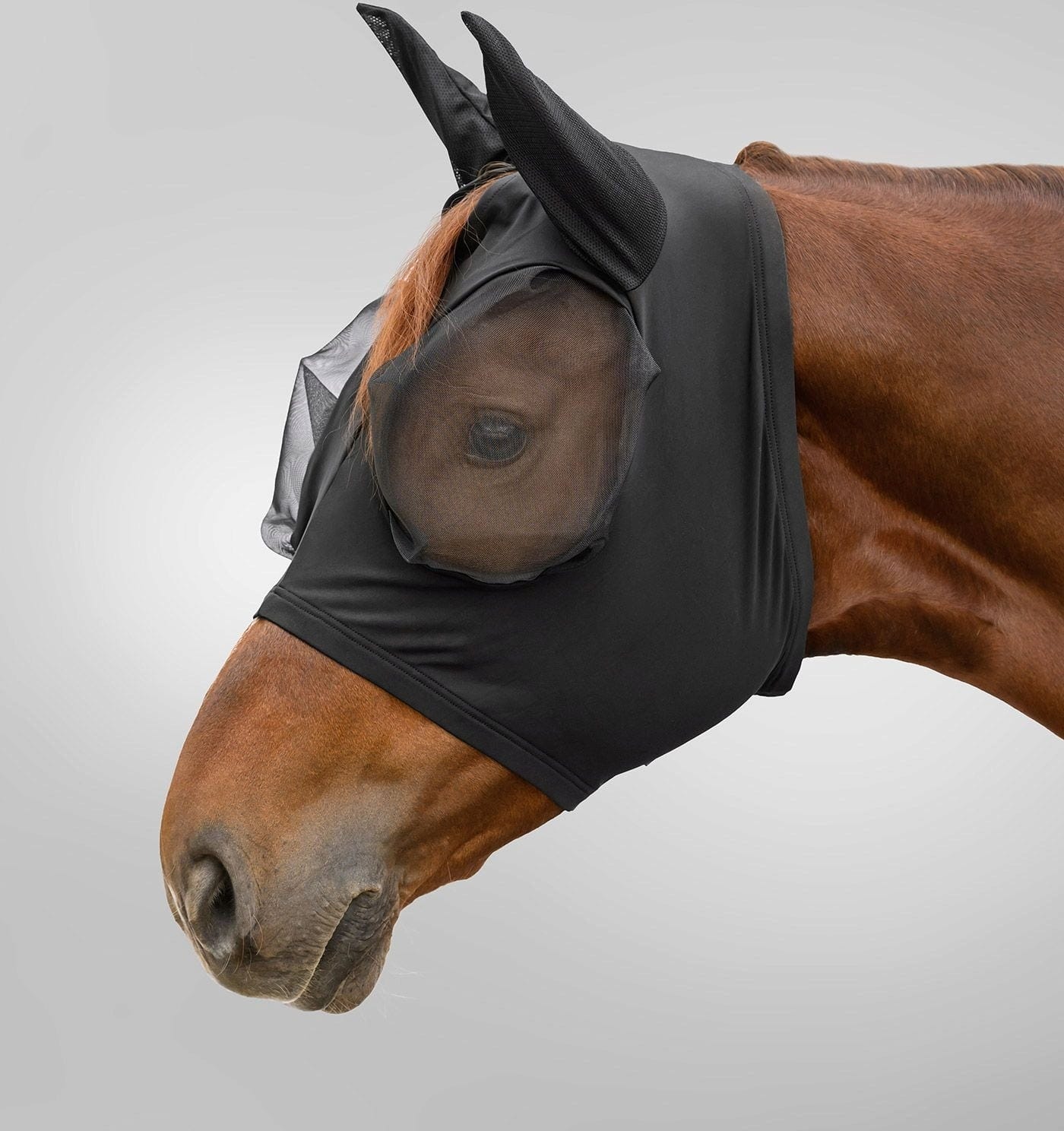 Маската е меко закопчана по всички краища, за да се предотврати протриване на чувствителни зони. Благодарение на интегрираните наушници, изработени от дишаща мрежа, вентилацията остава оптимална дори в топли дни, без да се допуска проникване на мушици. Широкото, еластично велкро закопчаване позволява бързо и лесно поставяне и гарантира, че маската стои сигурно и удобно на главата на коня, дори по време на интензивна активност. Идеален спътник за всеки, който цени гъвкавостта и максималния комфорт.
