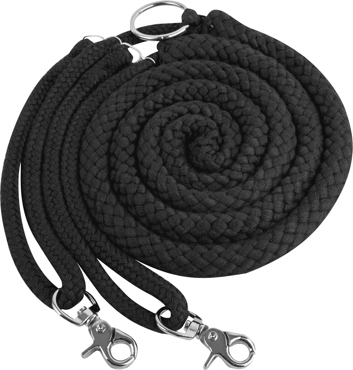 Черният лонжинг е здрав и издръжлив инструмент за коне. Стабилният и устойчив на разкъсване дизайн осигурява надеждна опора по време на тренировка. Централен пръстен държи въжетата заедно между краката на коня за лесно боравене и ефективна функционалност.