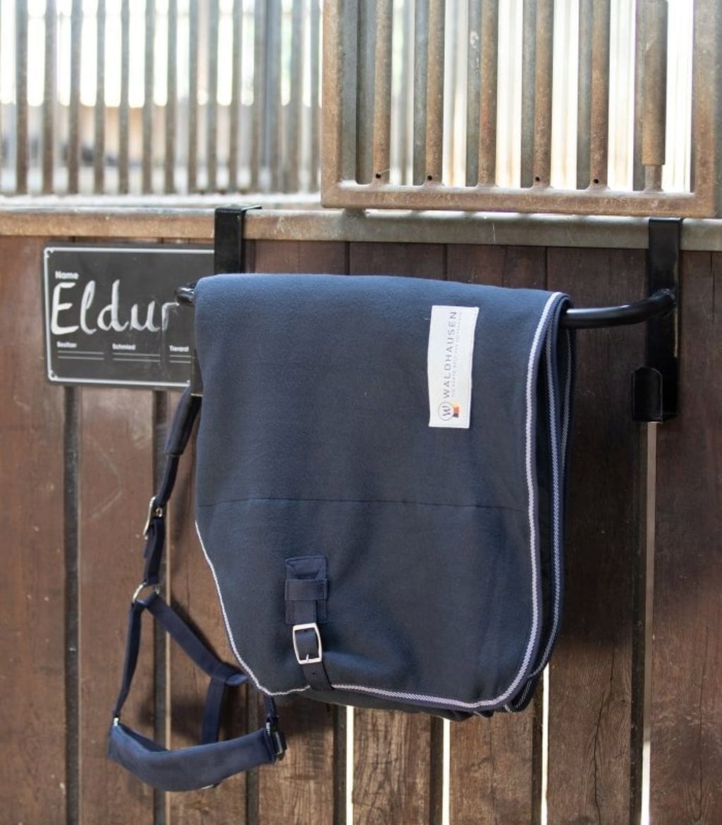 Тази практична стойка за одеяла е задължителна за ежедневието в конюшнята и особено когато сте в движение. Благодарение на интелигентния дизайн на окачването, вие си спестявате неудобството от пробиване и монтаж. Просто я окачете над вратата на конюшнята или преграда. Здравата метална стойка с покритие е регулируема по размер, адаптирайки се гъвкаво към вашите нужди.