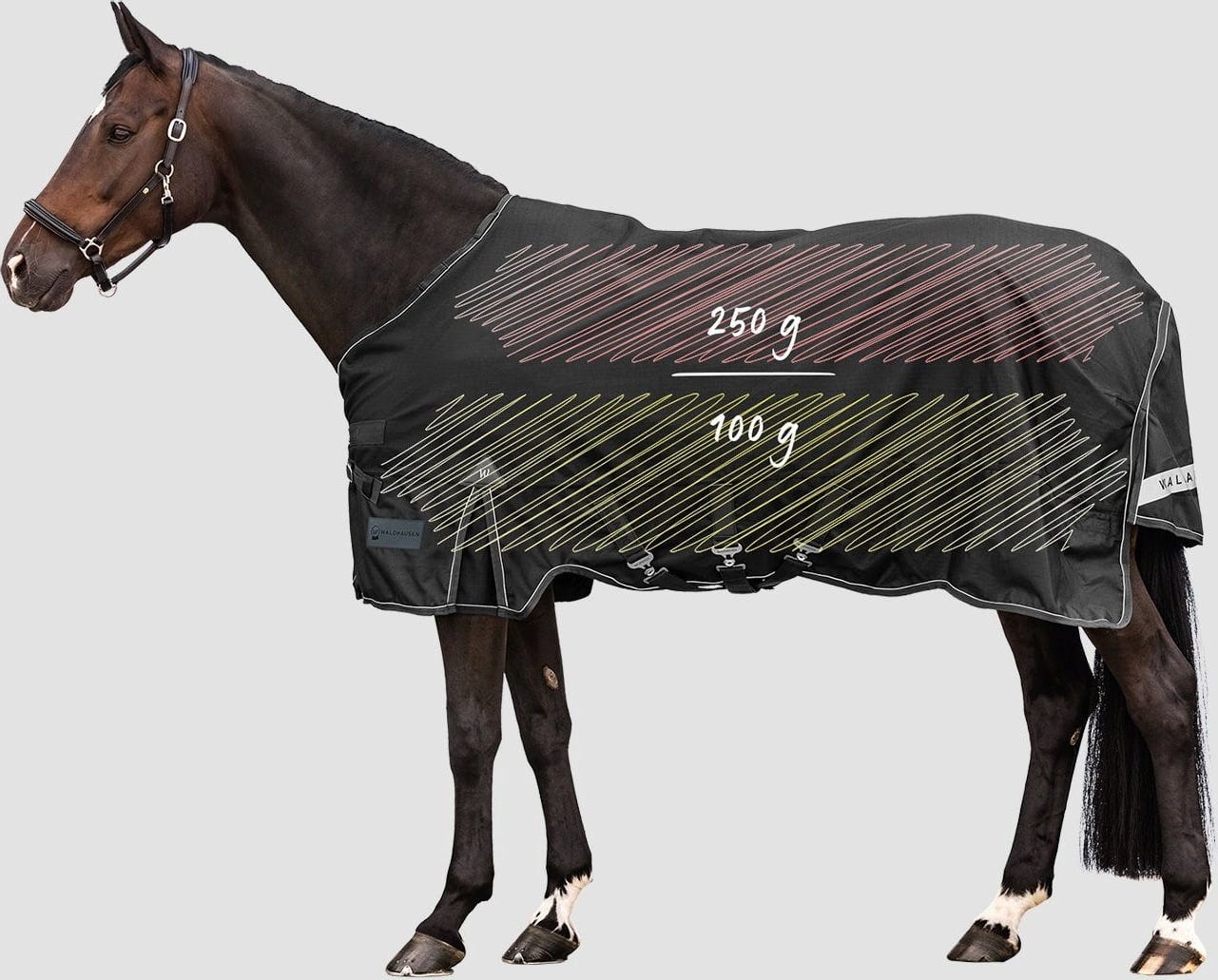 Търсите ли решение, което надеждно ще поддържа коня ви топъл и сух дори при минусови температури? Многослойното одеяло Waldhausen Scandic за открито, във версия 250 г/100 г, е зимният експерт, който се адаптира перфектно към естествените нужди на вашия кон и го защитава дори в най-студените дни. Тайната му се крие в ефективната му топлоизолация: Там, където е най-необходима – над гърба – мощен пълнеж от 250 г осигурява оптимална изолация срещу студа. Отстрани, където е необходима по-малко топлина и теглото може да окаже натиск, се използва по-лек пълнеж от 100 г. Тази интелигентна система осигурява максимална топлина с намалено общо тегло и гарантира отлично прилягане. Изработено от устойчив на разкъсване рипстоп външен материал от 1200 дение, одеялото е не само изключително издръжливо, но и надеждно водоустойчиво и дишащо. Това поддържа коня ви сух, дори когато навън е мокро и студено. Антибактериалната подплата поддържа одеялото хигиенично свежо. Меките дунапренени вложки при холката осигуряват облекчаване на натиска, а щедрият клин позволява на коня ви пълна свобода на движение в падока, осигурявайки неограничен комфорт. Scandic е щателно проектиран до последния детайл: от сигурното V-образно закопчаване отпред до големия, отразяващ капак на задната част, той предлага всички функции, от които се нуждаете за ежедневна употреба през зимата. Практичната инкрустация Stay Clean предпазва одеялото по време на проба. Инвестирайте сега в тази функционална защита от студено време, която пасва перфектно! Забележка: Това одеяло се предлага с инкрустация Stay Clean директно от вътрешната страна. Тя предпазва одеялото от коса и мръсотия по време на проба и може лесно да се свали след това – така че одеялото остава безупречно, ако не ви пасне! Тази инкрустация не е предназначена за постоянна употреба, а само за проба. Свалете я след като го пробвате, като просто я отлепите.