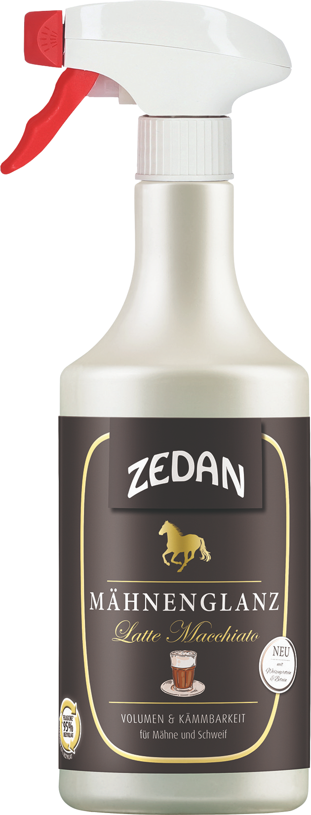 Със спрея за блясък за грива – Latte Macchiato от ZEDAN® ще придадете стилен завършек на вашия комплект за грижа, като същевременно ще се насладите на топлия аромат на кафе. Формулата подхранва дългия косъм на вашия кон с комбинация от пшенични протеини, бетаин и витамин E, като осигурява видима мекота и естествена жизненост, без да утежнява козината. Спреят образува защитен слой около структурата на косъма, ефективно отблъсква праха и предотвратява образуването на нови възли. Така се постига значително по-лесно разресване и дълготраен обем, а опашката остава плътна и блестяща.